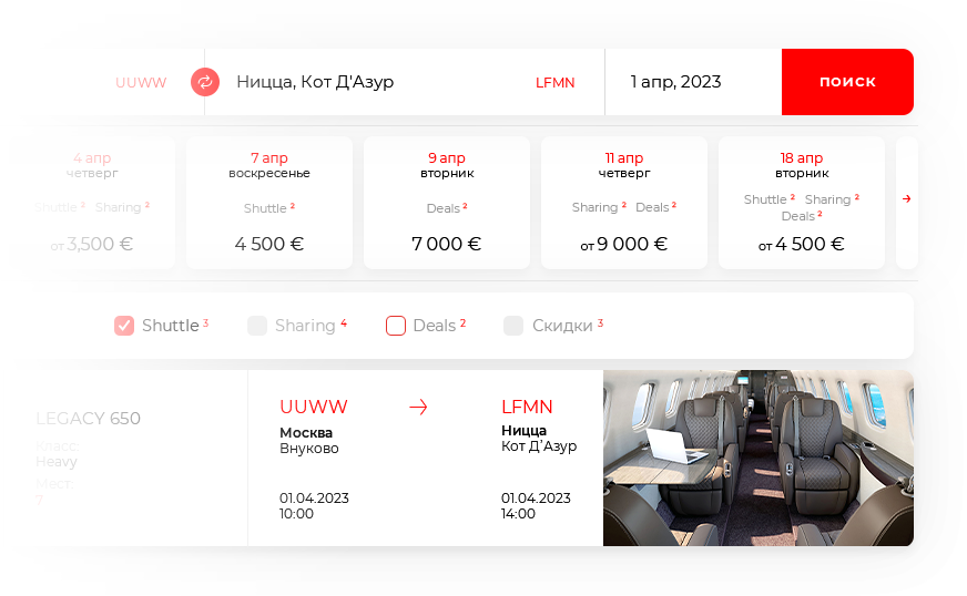 Арендуйте самолет по своему маршруту и датам, выбрав наиболее подходящий по бюджету и комфорту.